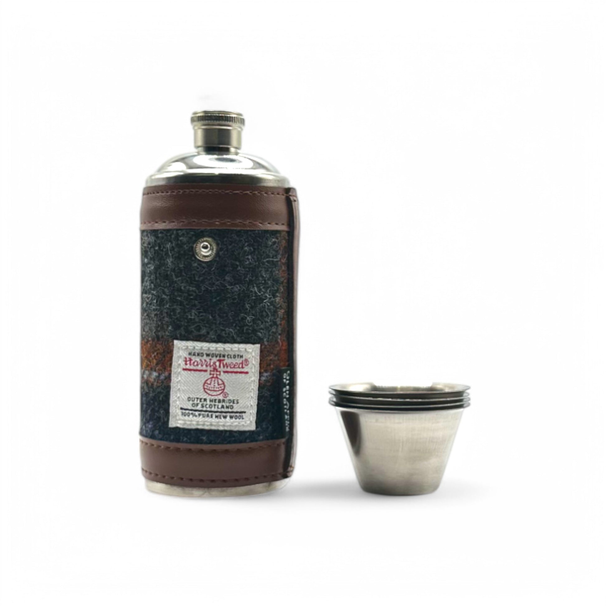 This Authentic Harris Tweed Hip Flask makes a fantastic gift. It comes complete with 4 stainless steel cups and is ideal for camping or outdoors. With a leather strap holding all four of the cups you can travel anywhere with this compact and neat hunting flask.