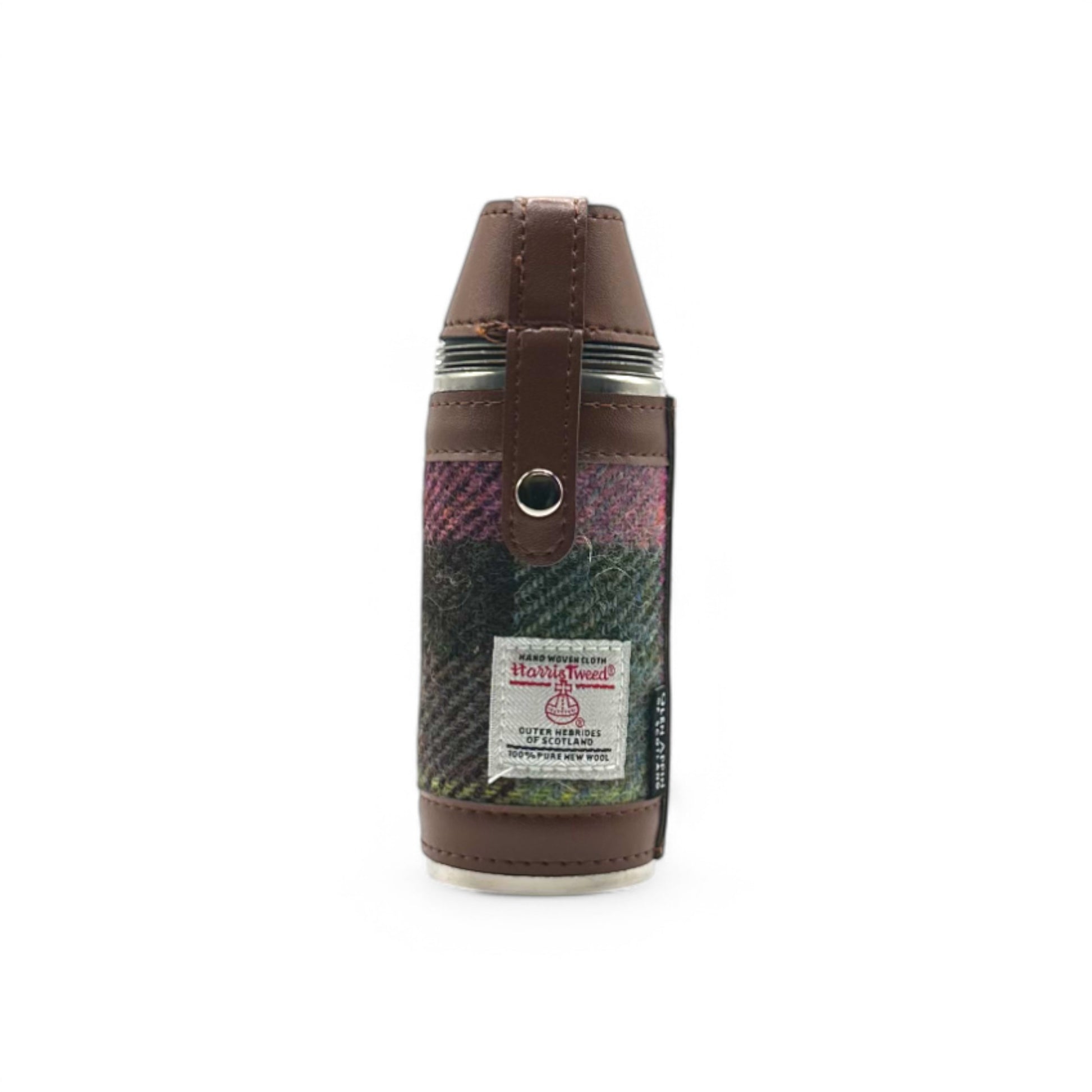 This Authentic Harris Tweed Hip Flask makes a fantastic gift. It comes complete with 4 stainless steel cups and is ideal for camping or outdoors. With a leather strap holding all four of the cups you can travel anywhere with this compact and neat hunting flask.