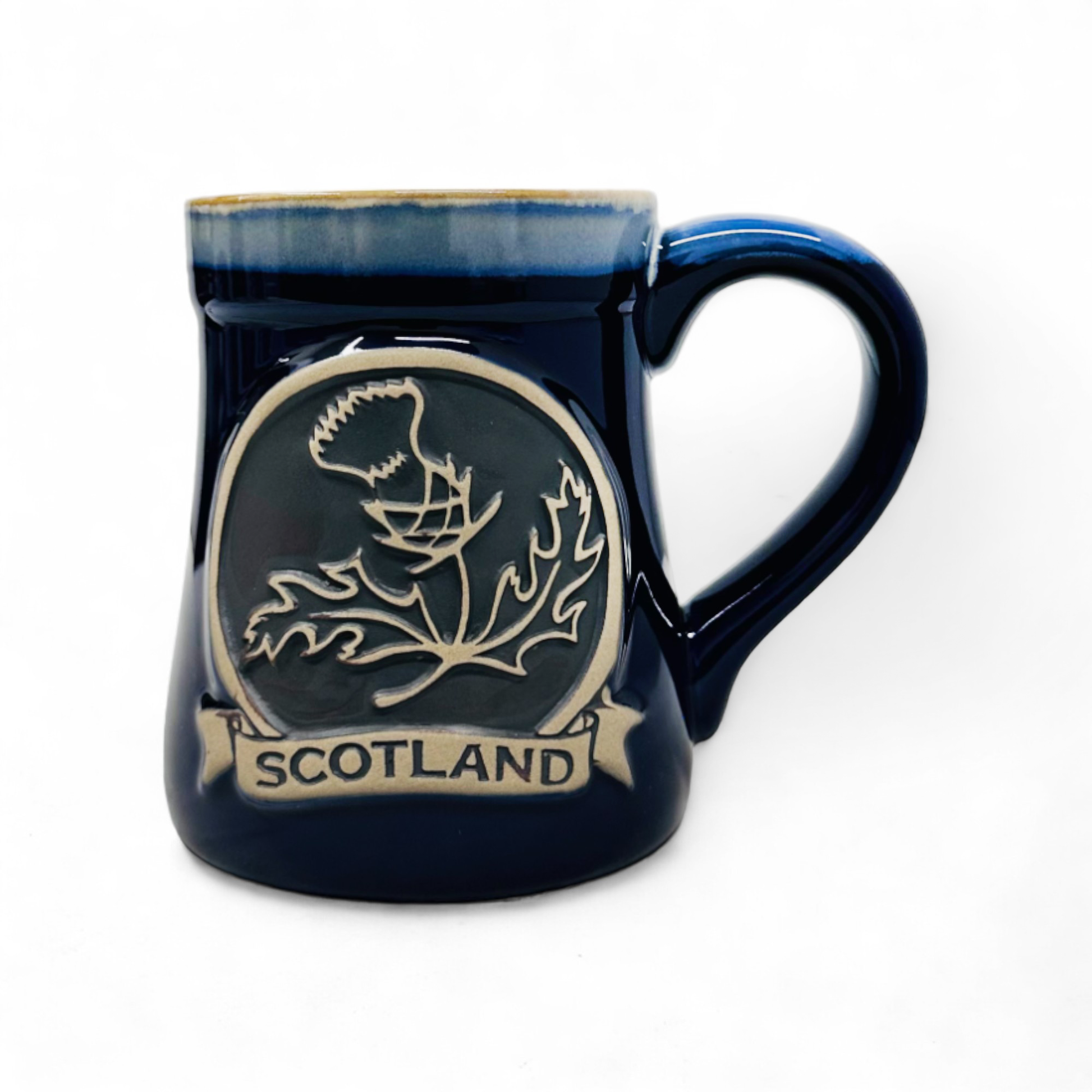 This sturdy stoneware mug showcases a detailed thistle design, highlighted by a vibrant blue enamel finish. Crafted for durability, it keeps drinks warm and resists scratches, making it perfect for everyday use. A stunning tribute to Scotland’s national flower, an ideal gift or keepsake.