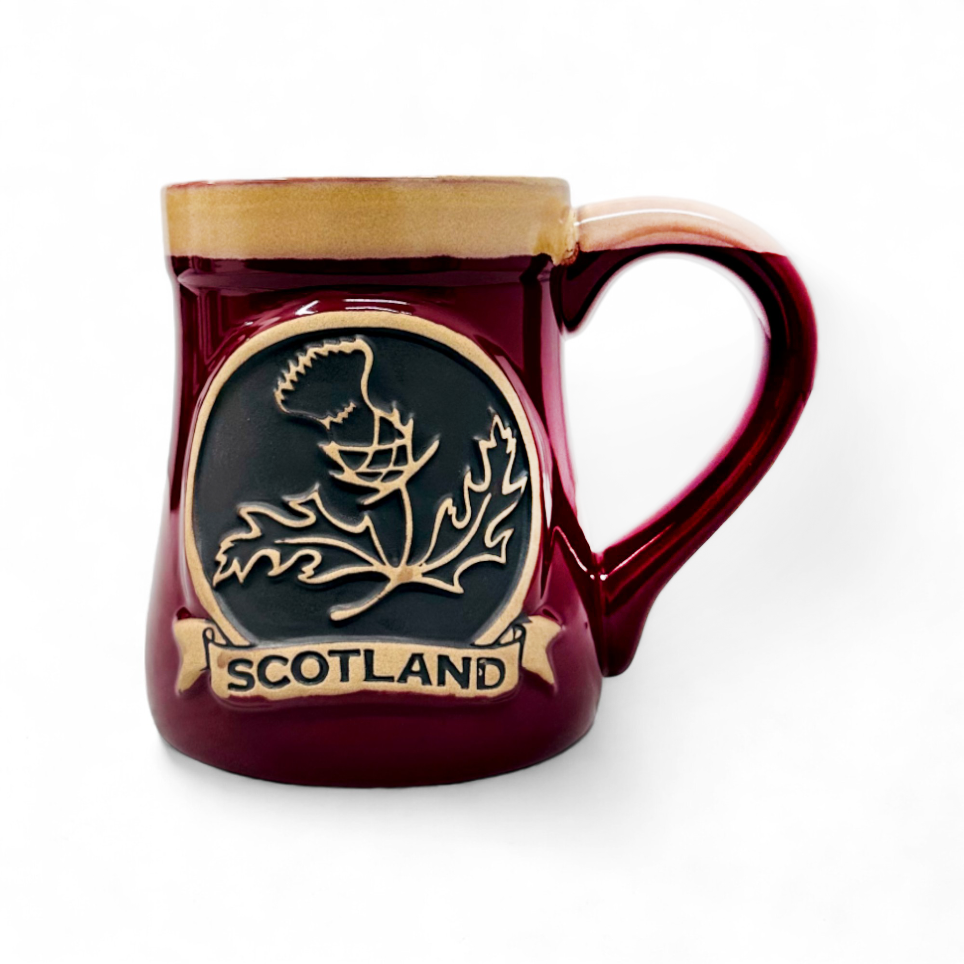 This sturdy stoneware mug features a detailed thistle design, finished in bold red enamel. Built for durability, it retains heat well and is scratch-resistant, making it perfect for daily use. A vibrant celebration of Scotland’s national flower, ideal as a gift or keepsake.